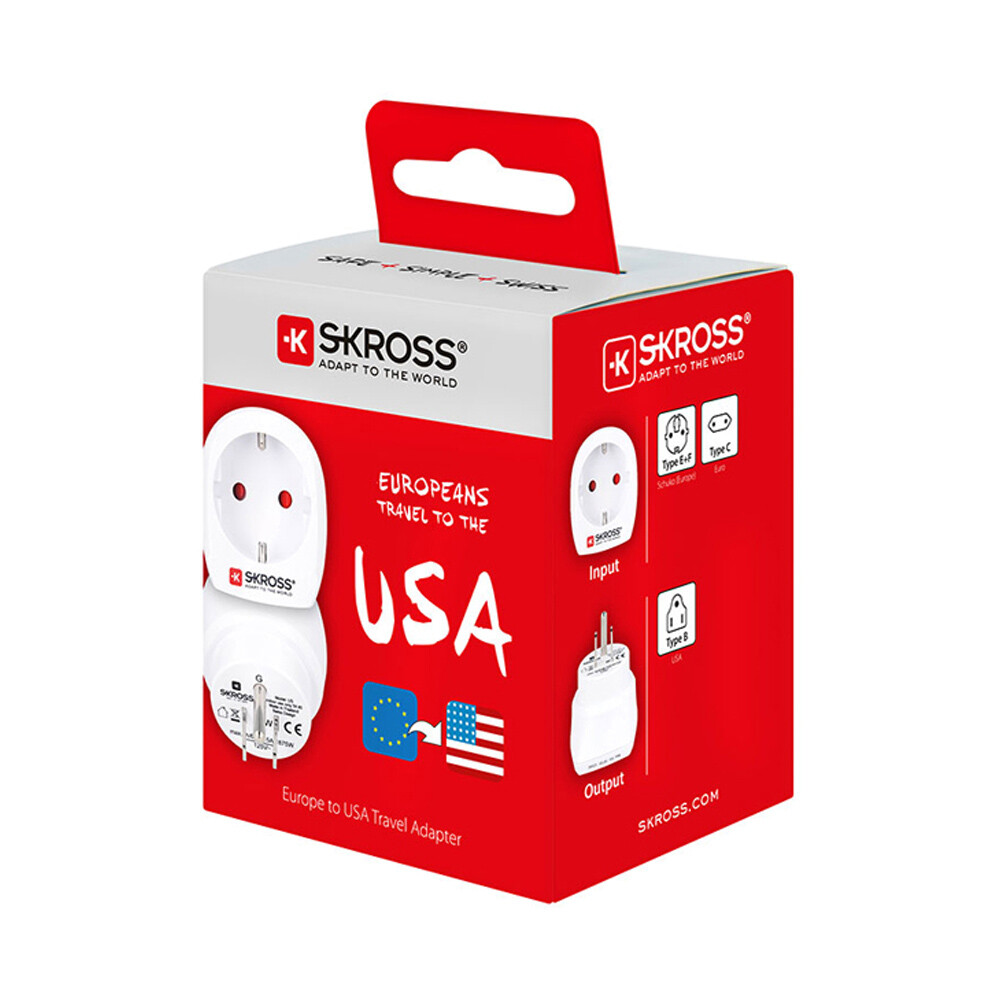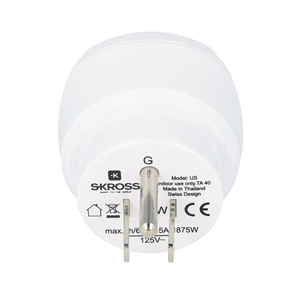ADAPTADOR EUROPEO A ESTADOS UNIDO SKROSS 1500203-E. DESENHADO EM SUIÇA. IDEAL PARA APARELHOS COM OU SEM LIGAÇÃO TERRA (2 E 3 POLOS). ENTRADA: EUROPA DE 3 POLOS (2P+T TIPO F) E EUROPA DE 2 POLOS. SAÍDA: ESTADOS UNIDOS. TENSÃO DE ENTRADA: 100V. 250V. CARGA MÁX: 15A. CLASSIFICAÇÃO DE POTÊNCIA: P. 100V/500W 250V/3750W. NÃO CONVERTE A VOLTAGEM