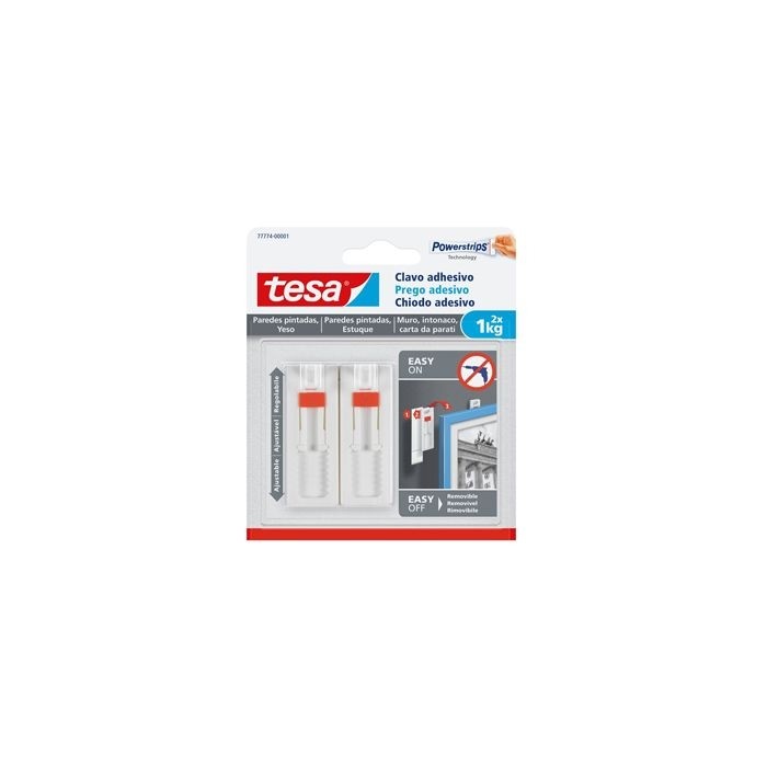 É sempre um pouco enervante pregar pregos com um martelo em superfícies texturadas e sensíveis. Agora, já não tem de o fazer. Os fortes Pregos Adesivos Ajustáveis para Papel de Parede e Reboco 1kg da tesa® são removíveis, reutilizáveis e não deixam marcas, nem mesmo em superfícies sensíveis. Os Pregos Adesivos Ajustáveis para Papel de Parede e Reboco 1kg® não são adequados para papel de parede de vinil, nem para superfícies não adesivas como silicone ou PTFE.