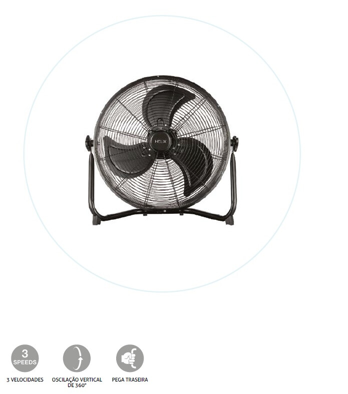 Ventilador de chão com 3 velocidades. Tem oscilação vertical de 360° para uma adaptação óptima a qualquer espaço.