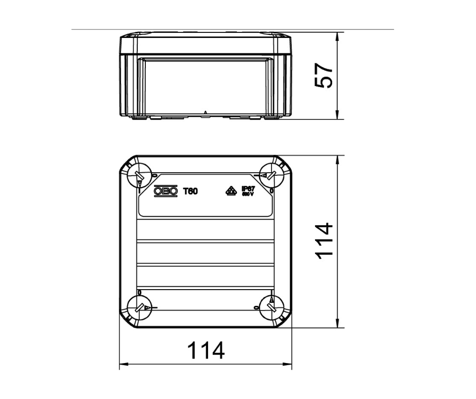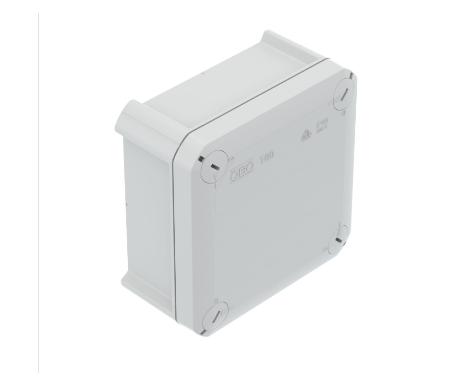 Caixa de derivação para conectar cabos em áreas interiores e áreas exteriores protegidas. Forma quadrada sem entradas. Adequado para a montagem na parede / teto e para a montagem em suportes para caixas de derivação. Com opção de fixação interna e montagem através de parafusos nos cantos. Tampa com fecho rápido, pode ser selada a chumbo. Fabricado em materiais livres de halogéneo. Caixa de derivação de acordo com a DIN EN 60670. Resistente ao fio incandescente segundo a DIN EN 60695-2-11, temperatura de ensaio 650 °C. Resistência ao impacto IK08 de acordo com a DIN EN 50102.