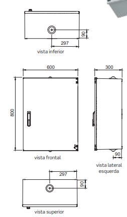 Caixa e porta: Poliéster reforçado a fibra de vidro auto-extinguível cinza RAL 7035.